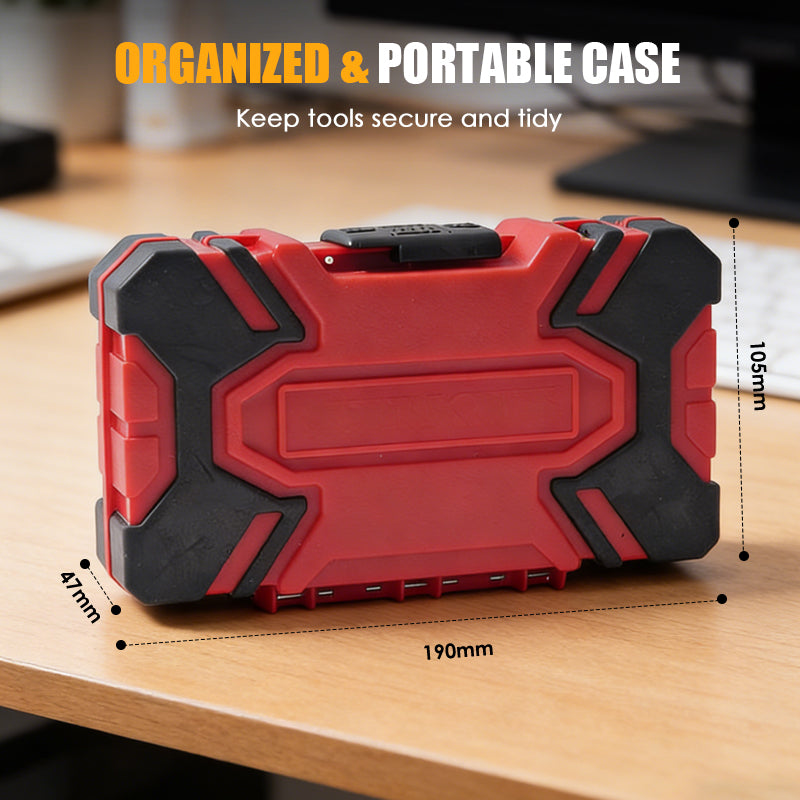 TRAGBARER AUFBEWAHRUNGSKOFFER – Ein robuster und kompakter Koffer hält jedes Teil ordentlich organisiert und sicher. Jeder Bit verfügt über einen eigenen Steckplatz, sodass Sie das benötigte Werkzeug leicht finden und Ihre Werkzeuge beim Transport schützen können.