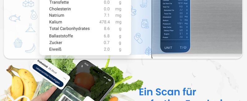 UMFASSENDE NÄHRWERTANALYSE - Verfolgt 19 wichtige Nährwertkennzahlen, darunter Kalorien, Fett, Eiweiß und Kohlenhydrate. Dies verschafft Ihnen einen vollständigen Überblick über Ihre Ernährung und befähigt Sie, gesündere und besser informierte Ernährungsentscheidungen zu treffen.