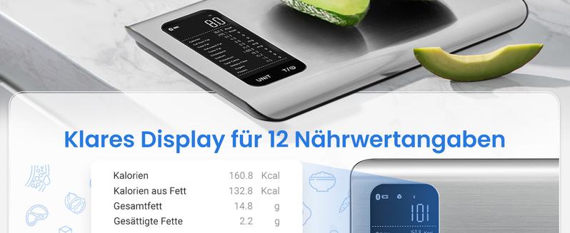 KLARES DIGITALDISPLAY - Verfügt über einen hellen, gut ablesbaren digitalen Bildschirm, der Gewicht und wesentliche Nährwertinformationen auf einen Blick anzeigt. Sein modernes, schlankes Design verleiht Ihrer Küchenarbeitsplatte außerdem eine Note von Eleganz.